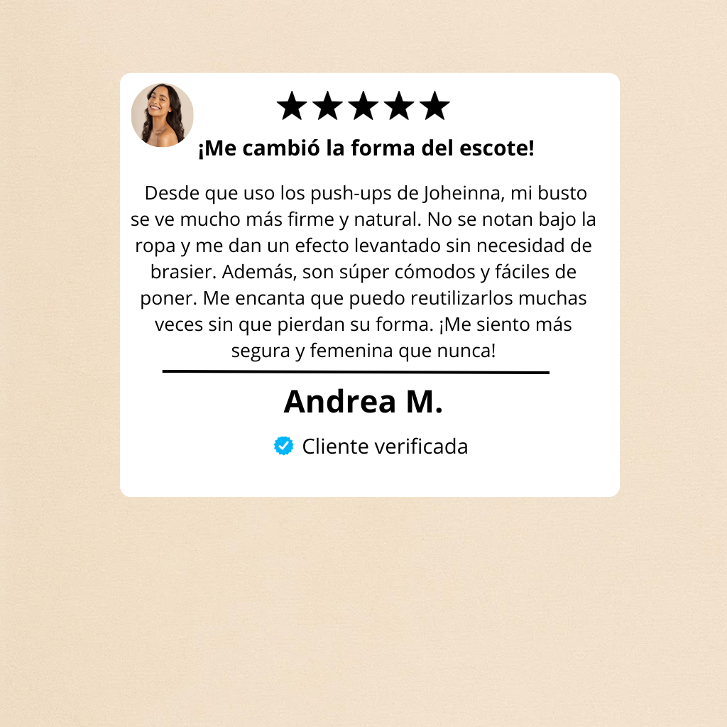 Descubre el secreto de un escote perfecto con los push-ups de silicón Joheinna. Diseñados para adaptarse a todo tipo de busto, realzan tu figura de manera natural y sin necesidad de brasier. Su textura suave, ligera y reutilizable te ofrece comodidad durante todo el día, mientras su diseño invisible se mantiene discreto bajo cualquier prenda.